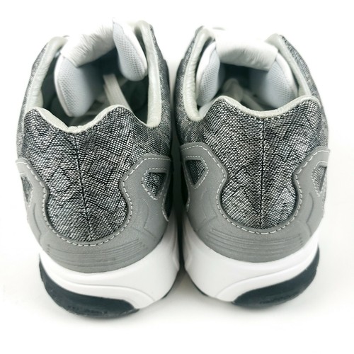 features a textile upper decorated with a geometric pattern and a