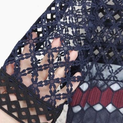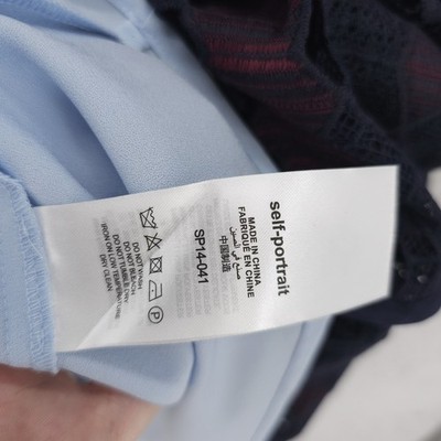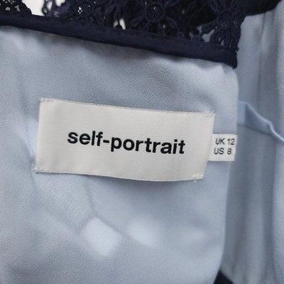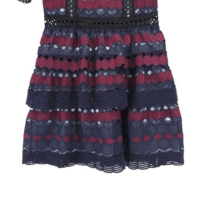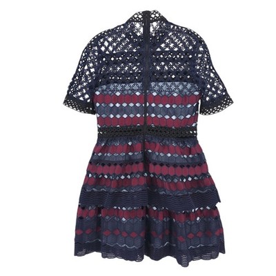 SELF-PORTRAIT Hexagon Lace Dress Navy Burgundy Tiered Mock Neck Zip US 8